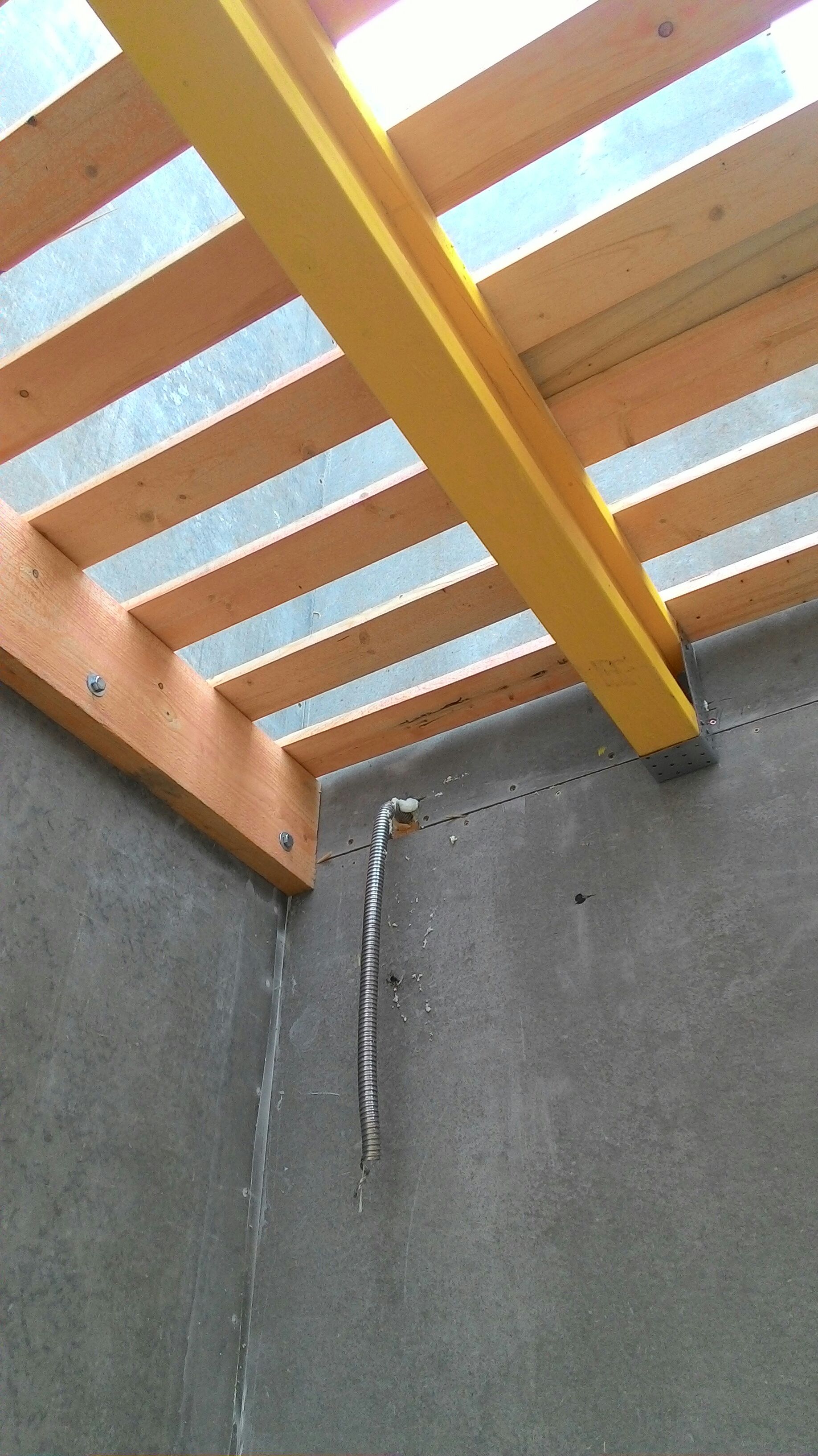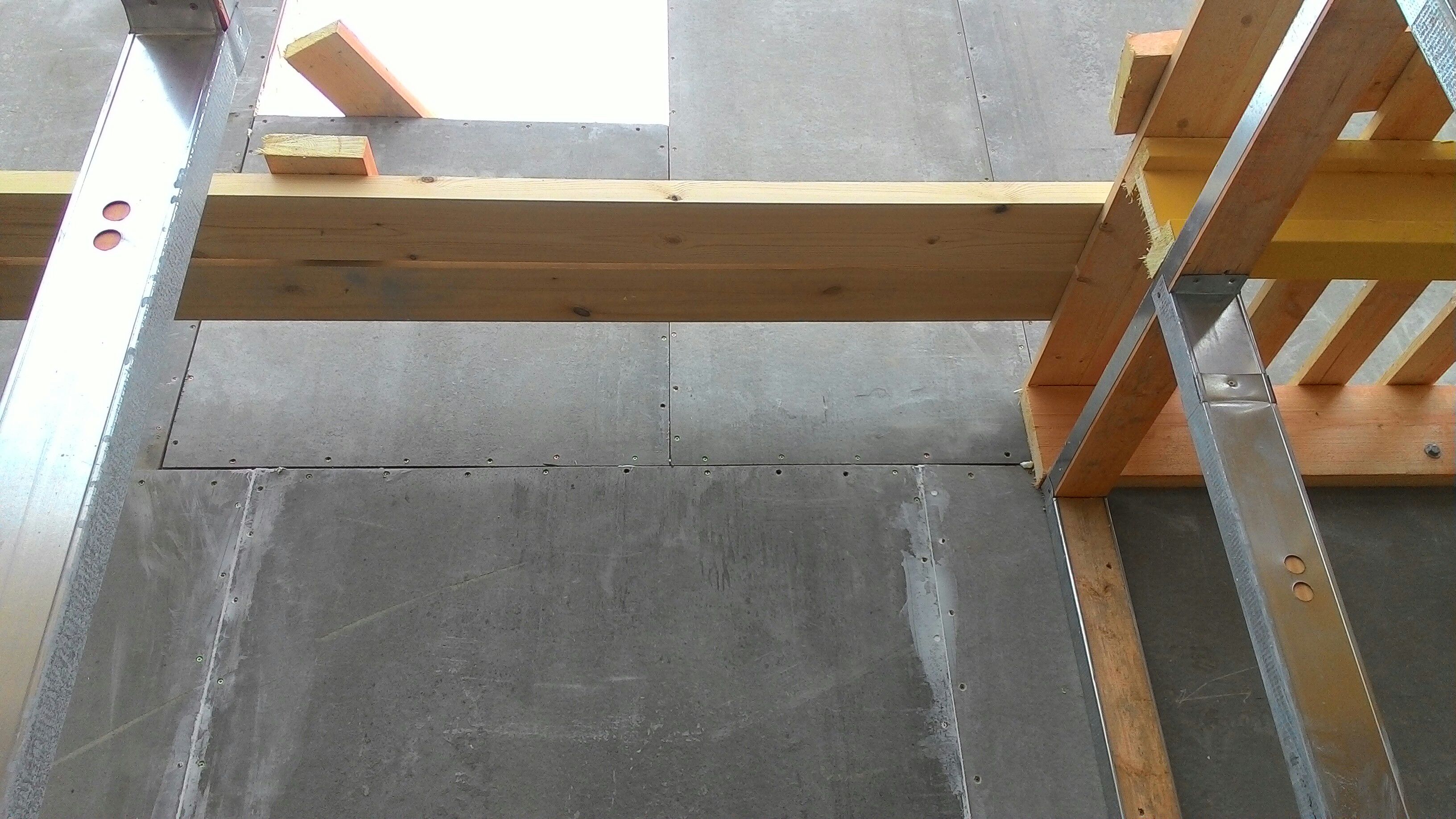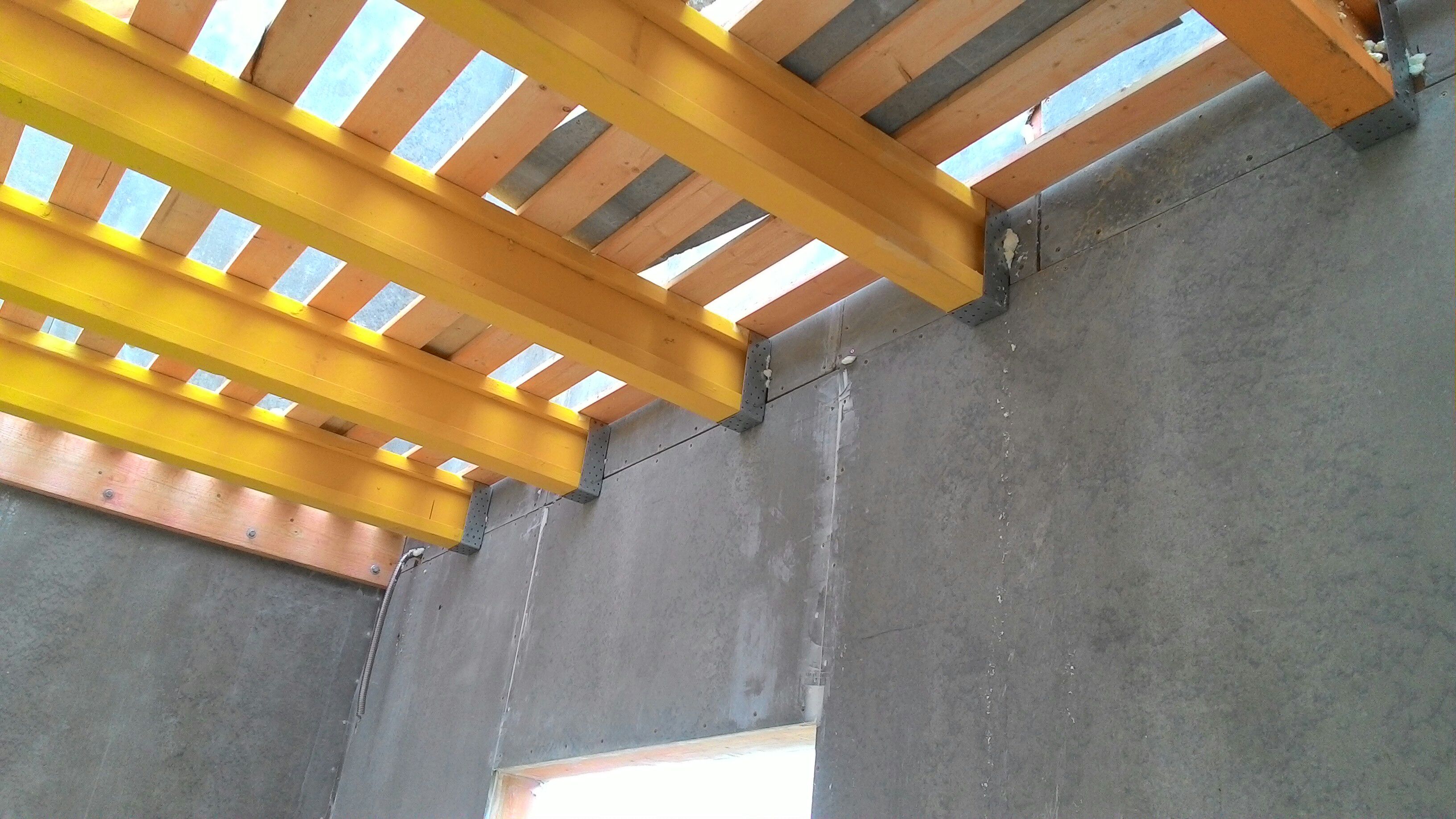 В межэтажных перекрытиях в качестве несущих лаг мы применяем двутавровые балки собственного производства с влагостойкой 24 мм. фанерой в сердечнике.