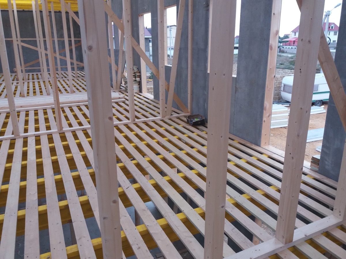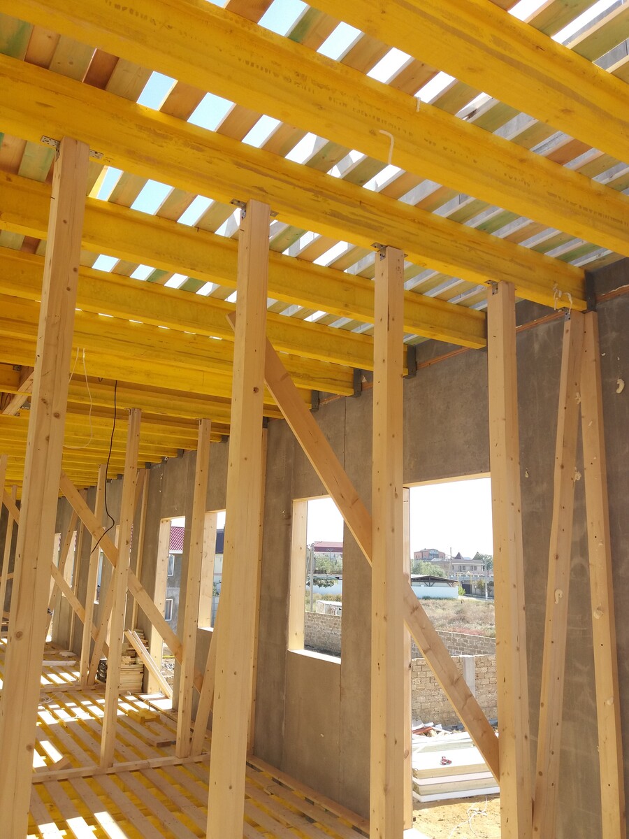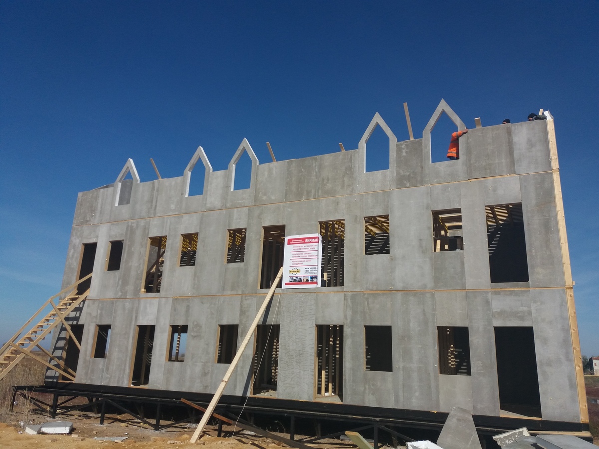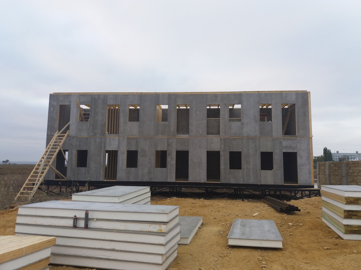из СИП панелей из ЦСП размером 2700*1200*168 мм с антисептированным калиброванным пиломатериалом камерной сушки (46*140 мм). Монтаж каркасов несущих перегородок из пиломатериала 38*89 мм (76*89 мм).