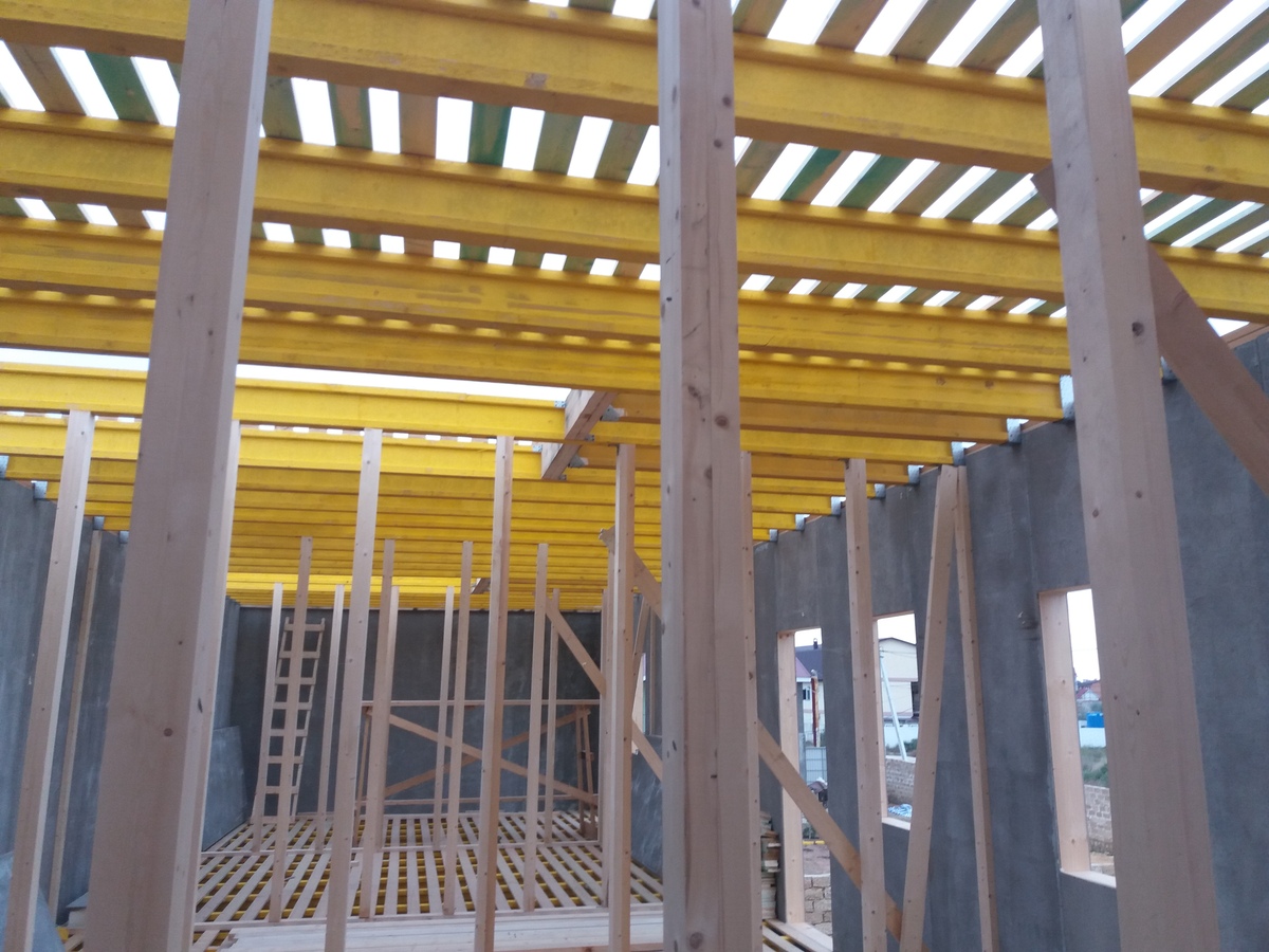 В межэтажных перекрытиях в качестве несущих лаг мы применяем двутавровые балки собственного производства с влагостойкой 24 мм. фанерой в сердечнике.