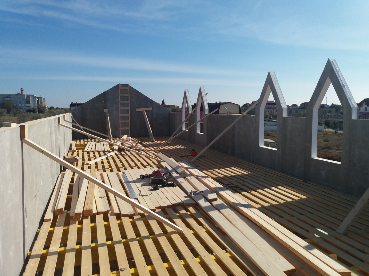 пиломатериал 1-го сорта естественной влажности, антисептированный (стропила 50*150 мм, обрешетка, поперечная обрешетка), пароизоляция А, D, утеплитель 150 мм, софиты (С-8 профиль), кровля - металлопрофиль (металлочерепица).